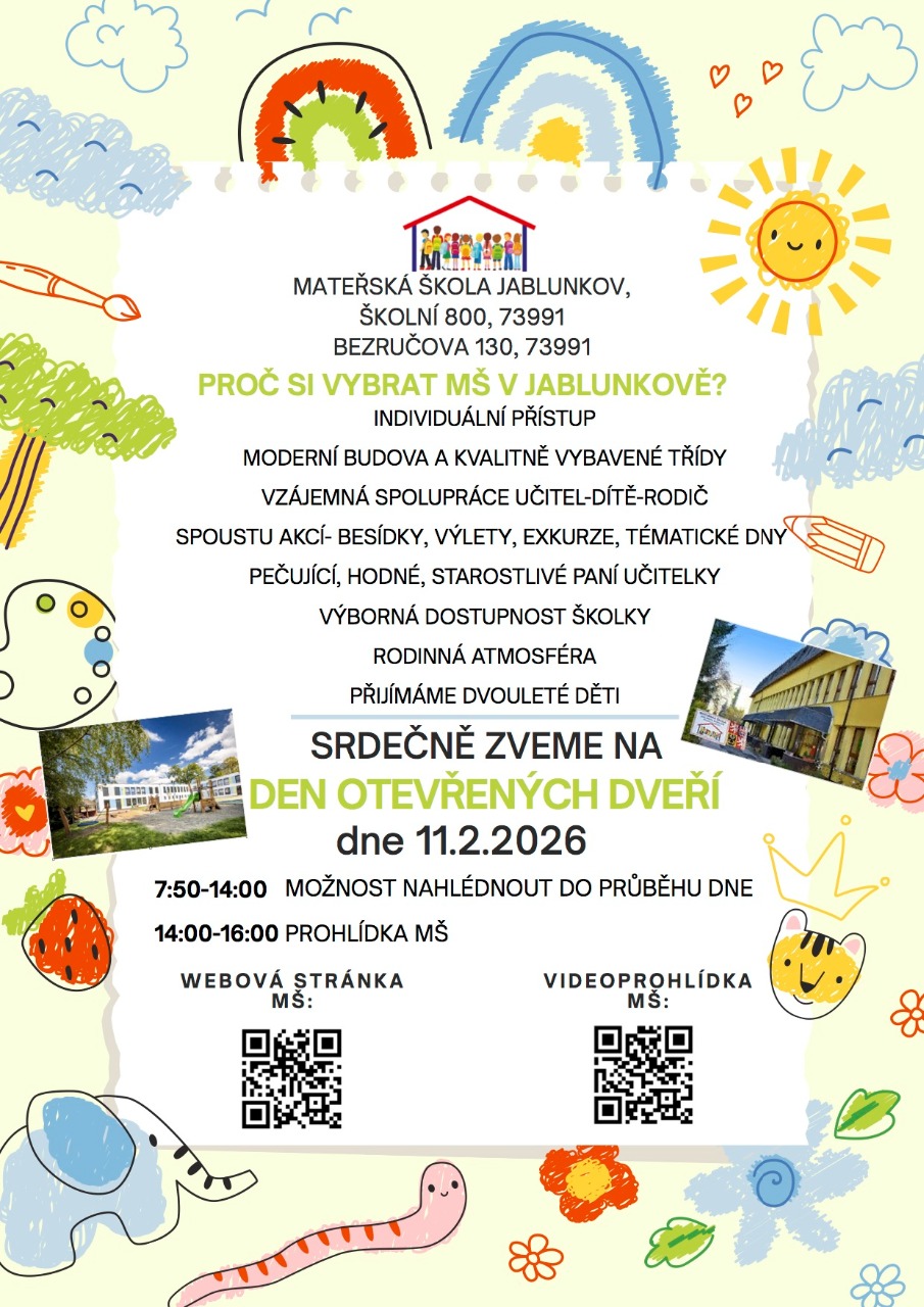 Vítáme Vás na stránkách mateřských škol - MŠ Jablunkov Školní 800, příspěvkové organizace a elokovaného pracoviště MŠ Bezručova 130.