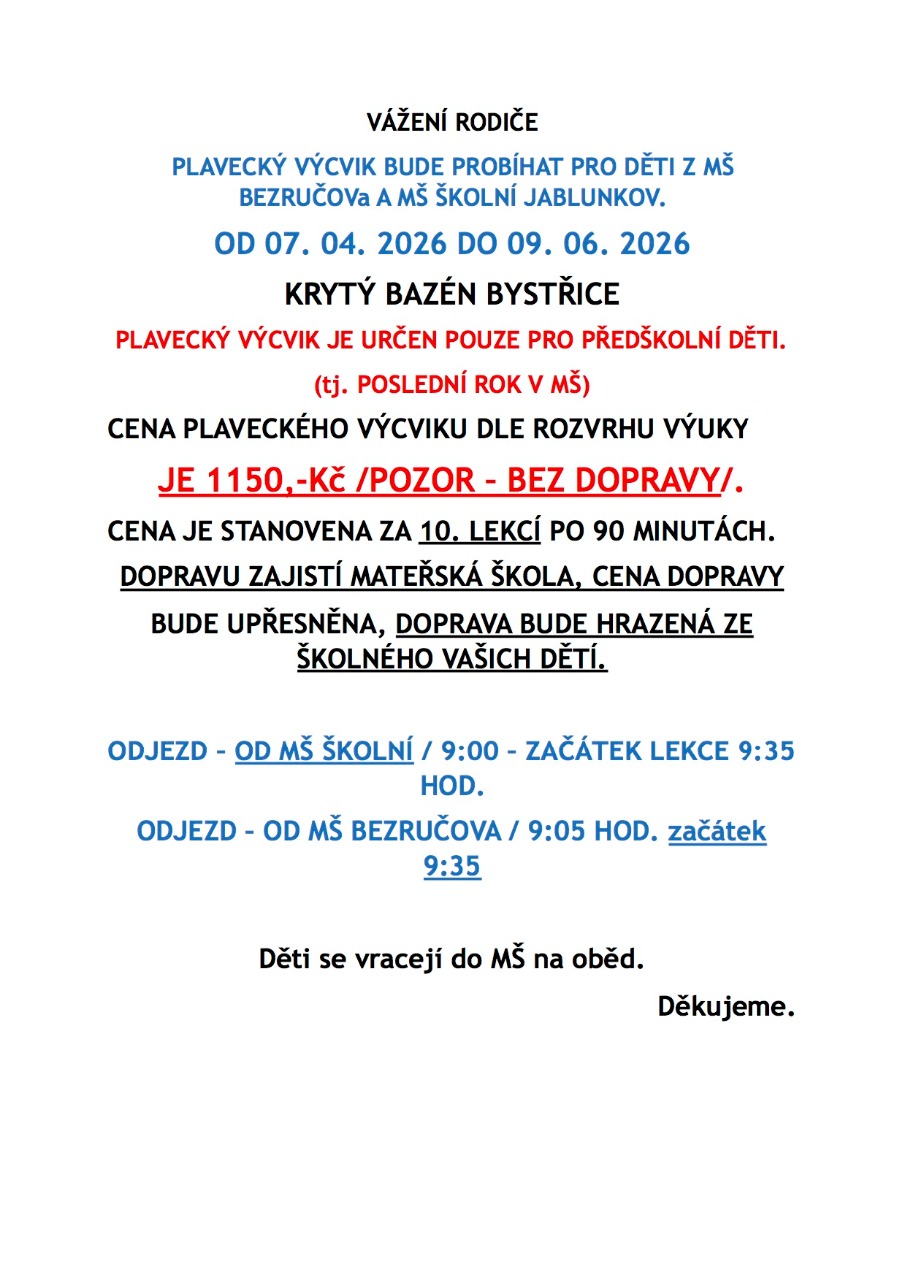 Organizace plaveckého kurzu pro předškolní děti